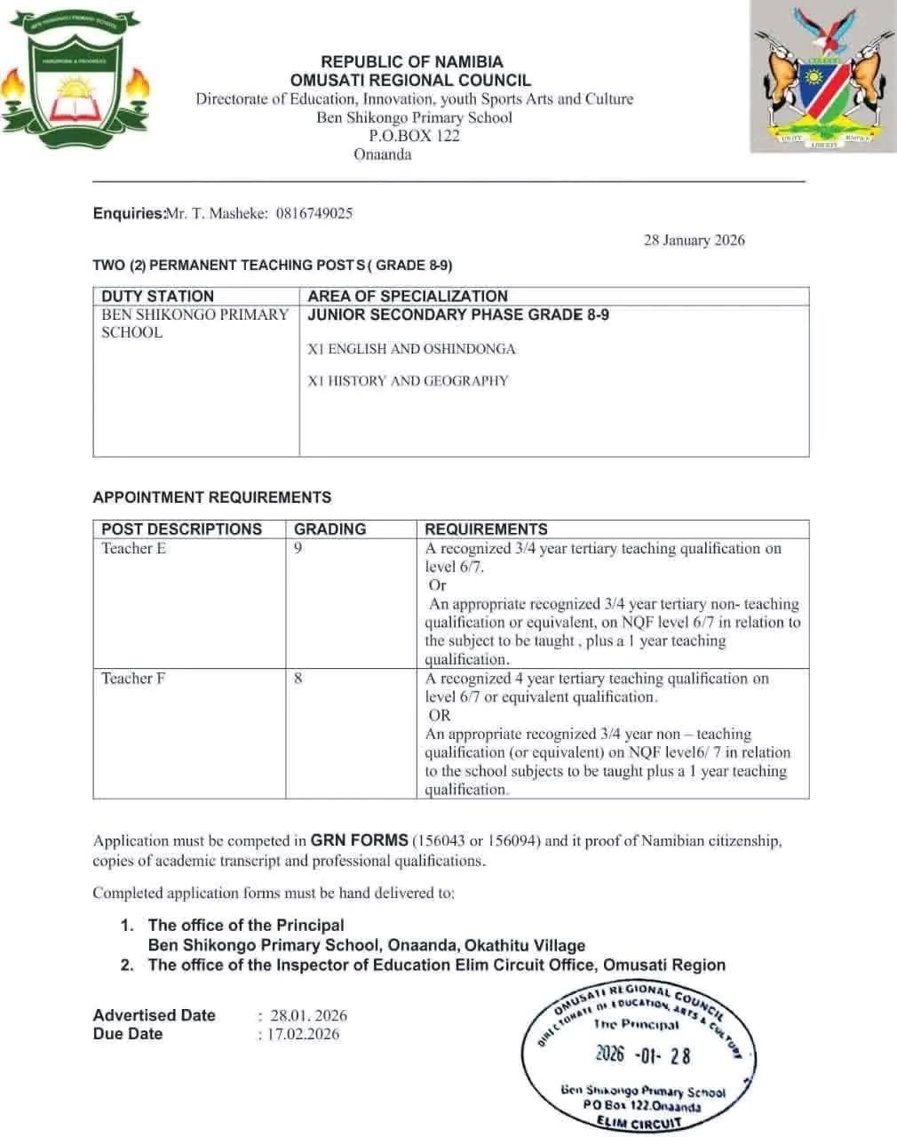 <img class="alignnone wp-image-60007 size-full" src="https://jobs4na.com/wp-content/uploads/2026/02/Ben-Shikongo-Primary-School-Onaanda-Okathitu-Village.jpg" alt="" width="1010" height="1280" />
