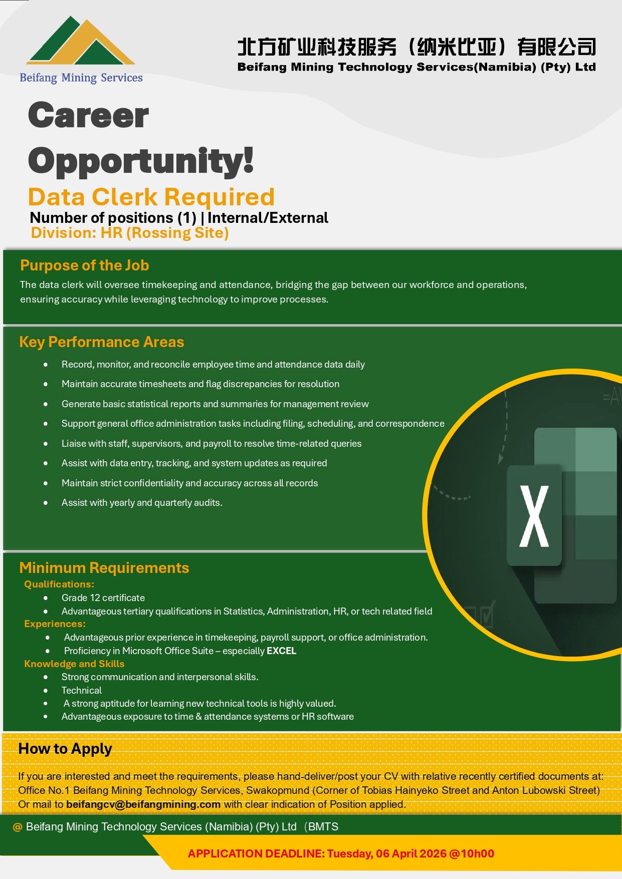 Job Vacancy: Data Clerk position(1) Application Due Date: 6th April 2026Qualified candidates should send their applications to cv@beifangmining.com