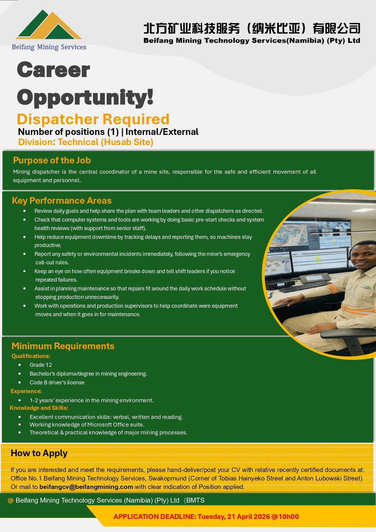 Mining Dispatcher position(1) Application Due Date: 21st April 2026Qualified candidates should send their applications to cv@beifangmining.com